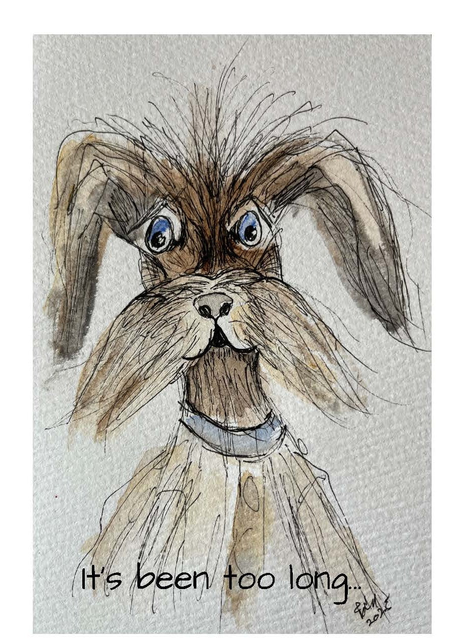This scruffy, wild eyed pup says what we are all thinking - it's definitely time to check in. This card is the perfect mix of humor and heart, ideal for reconnecting with a friend, sending a smile, or reminding someone they're missed (before you totally unravel).