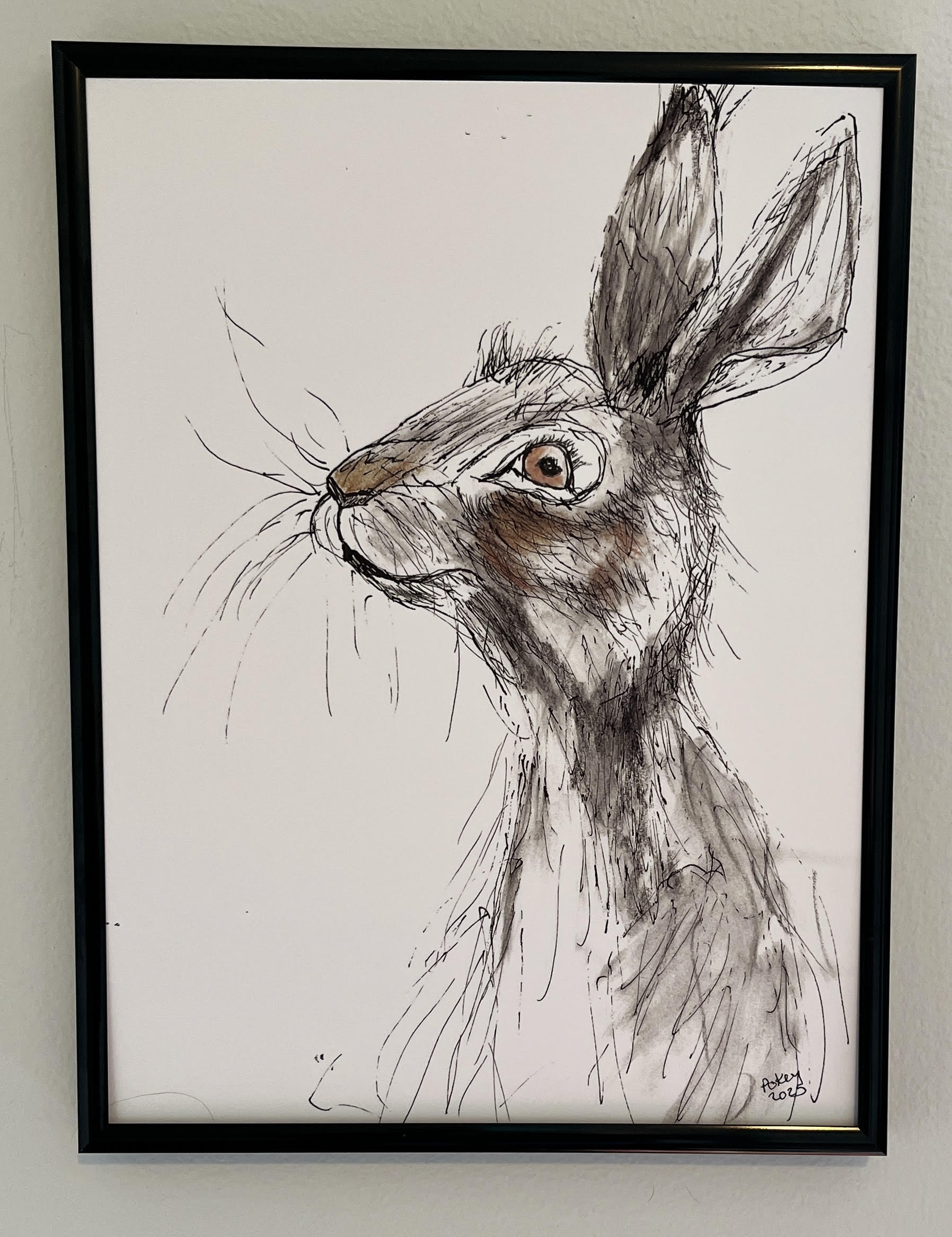 This expressive rabbit comes to life with delicate ink lines, charcoal, and soft watercolor washes. Its alert gaze, detailed whiskers, and slightly tousled fur capture a perfect blend of curiosity and calm.